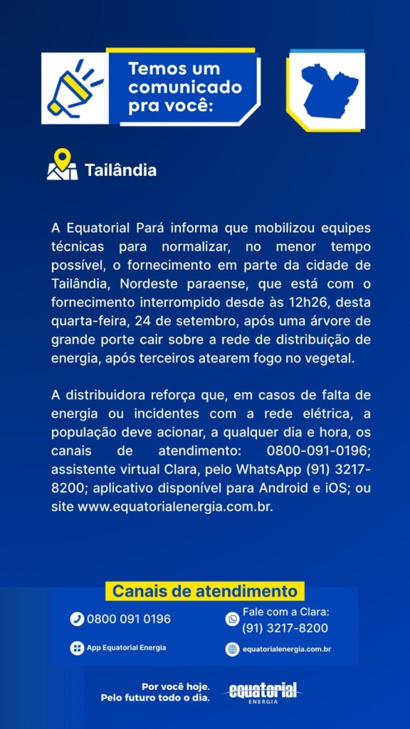 O Portal Tailândia entrou em contato com Equatorial Energia, operadora Vivo e Cosanpa.