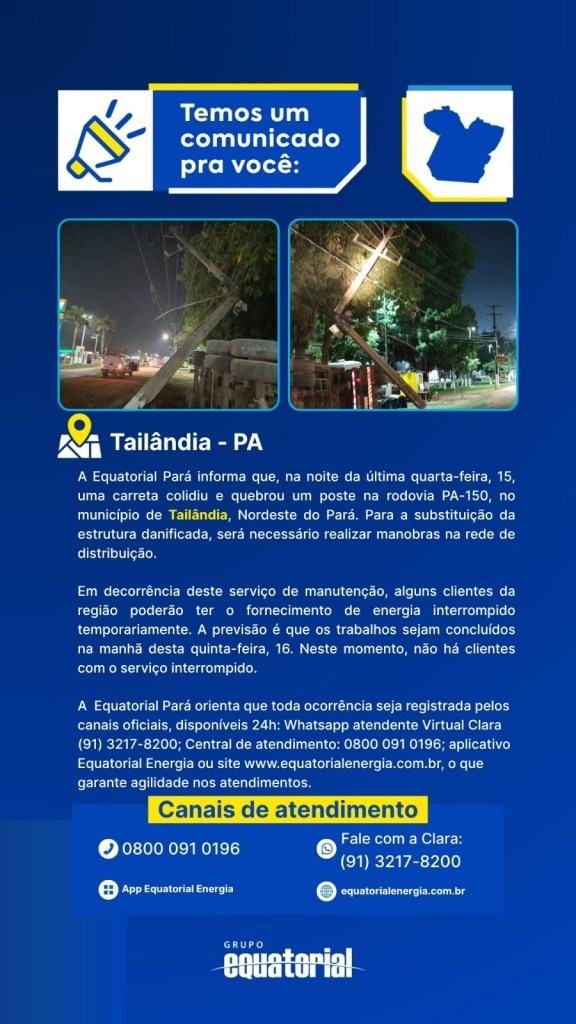A Equatorial Energia emitiu um comunicado após o ocorrido. Segundo o informativo, alguns clientes podem ter o fornecimento de energia interrompido temporariamente devido à substituição do poste.