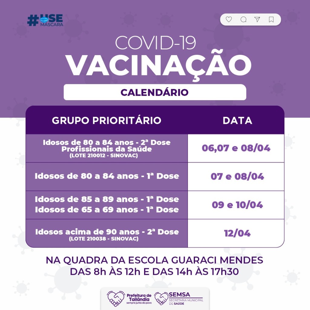 A Prefeitura de Tailândia divulgou nesta sexta-feira(9) o calendário de vacinação para os idosos de 85 a 89 anos e 65 a 69 anos.