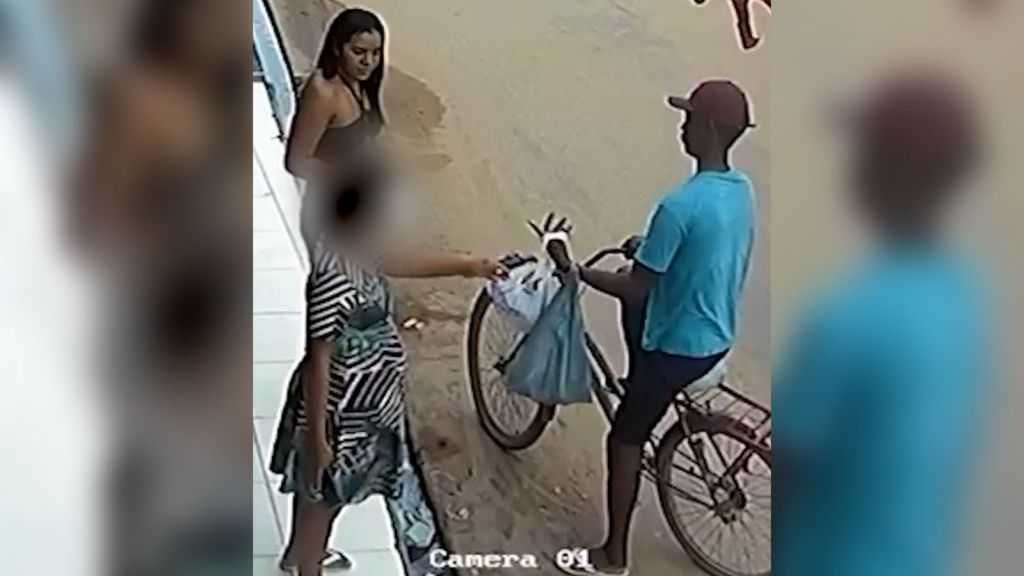 Após sair do estabelecimento, ela entrega a sacola com os produtos a um homem que a aguardava do lado de fora em uma bicicleta.